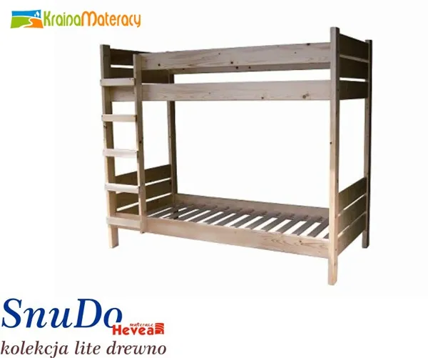 Łóżko Piętrowe SNUDO - tak jak inne łóżka z serii "lite drewno" produkowane jest z drewna sosnowego i świerkowego pozyskiwanego z najlepszych górskich siedlisk. "SNUDO" -  mocne piętrowe łóżko o ciekawym, oryginalnym wzornictwie, posiadające atest instytutu Technologi Drewna w Poznaniu. Badania bezpieczeństwa użytkowania potwierdziły wytrzymałość i solidne wykonanie. Łóżko SNUDO zawiera dwa szczebelkowe stelaże zapewniające zdrowy i komfortowy wypoczynek.