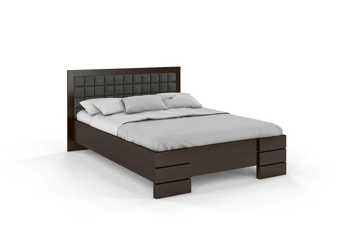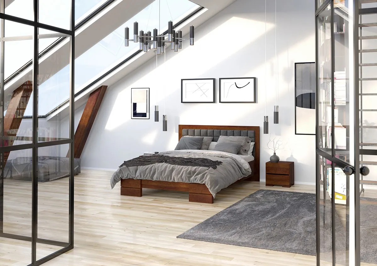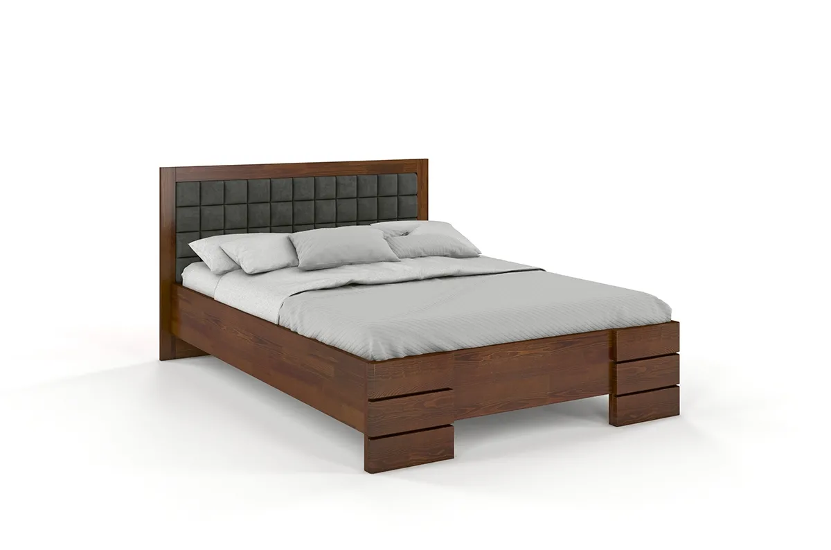 Drewniane łóżko z tapicerowanym zagłówkiem