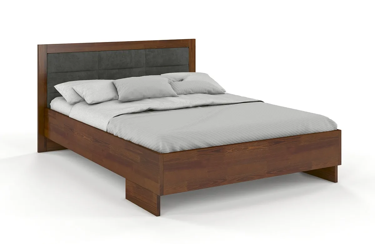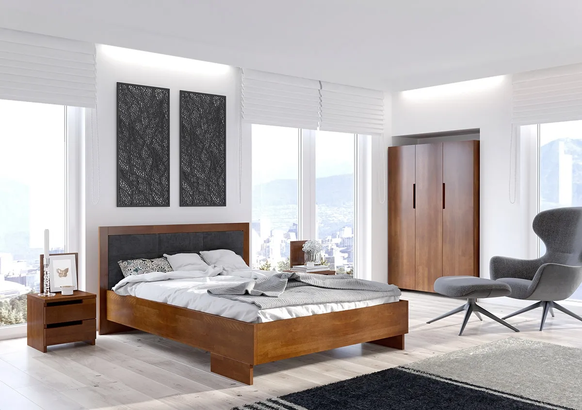 Drewniane łóżko z tapicerowanym zagłówkiem