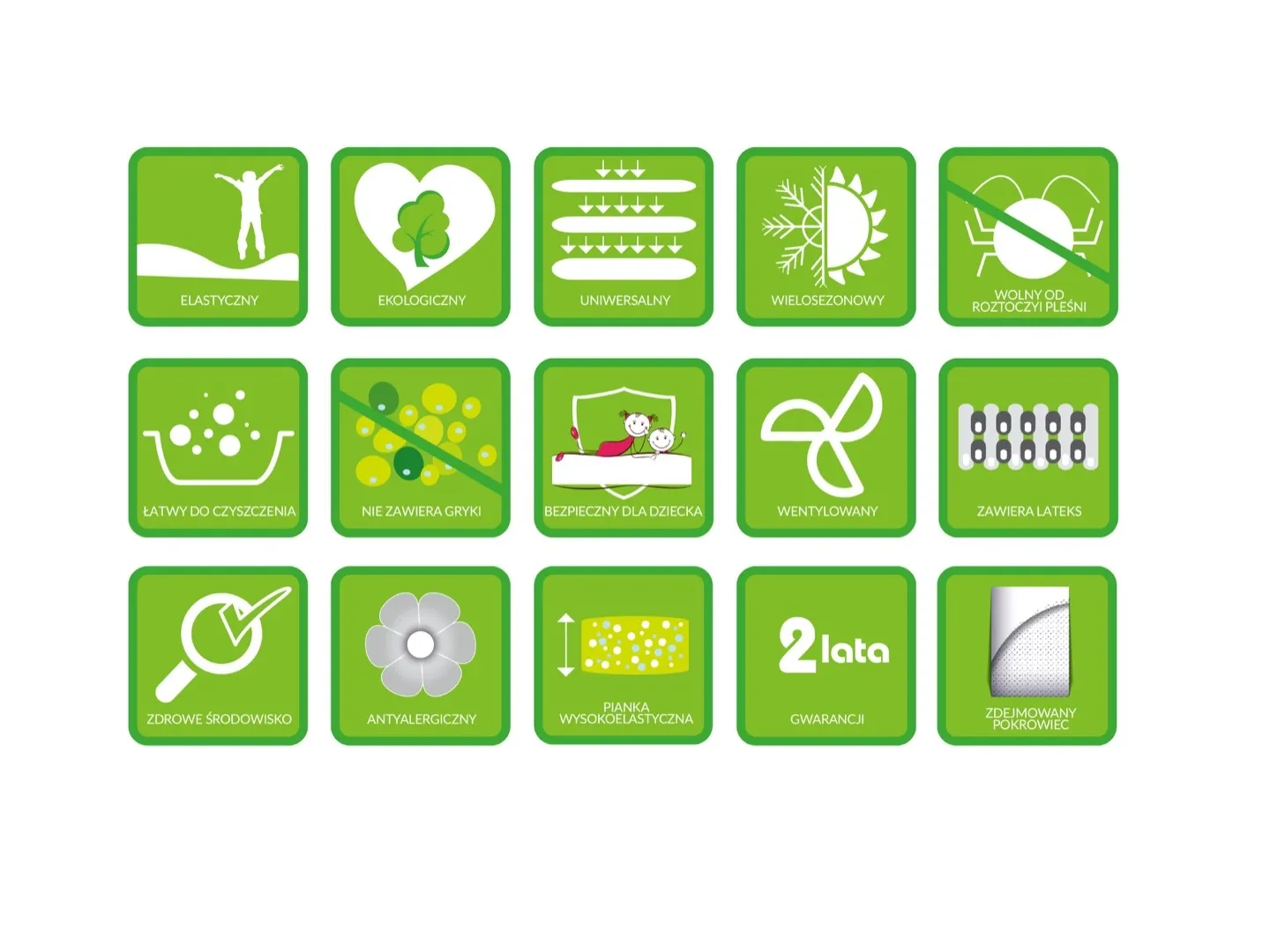 UWAGI: Materac posiada dwie strony użytkowe (piankową i lateksową), stopień twardości - H3/H2 (twardy, średnio twardy). Konstrukcja pozwala na swobodne obracanie pianek, bez użycia kleju!