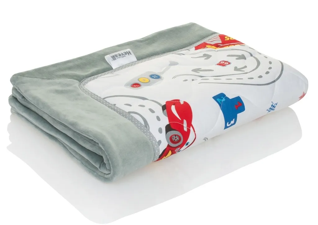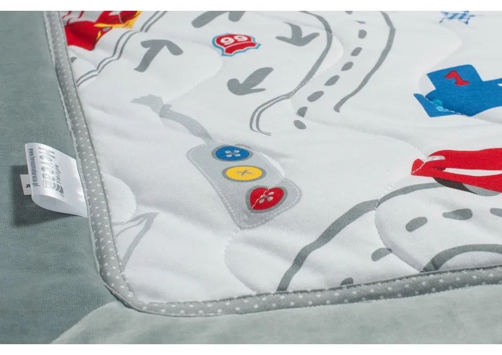 Kolorowy puszysty, dwustronny, miękki i antyalergiczny pled. Nakładany na łóżeczko, sofkę, materac. Idealny do przykrycia dziecka w domu a także na spacerze, na tarasie, balkonie, podczas wycieczki czy podróży. Jeden produkt, wiele zastosowań. Welur w szarym kolorze oraz dzianina typu interlock z certyfikatem Bezpieczny dla dziecka. Produkt można prać w temperaturze 60C. Bawełna 100%. Produkt antyalergiczny.
